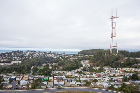 Residential area on a mountain at San Francisco, California. Suburbs of San Francisco with apartment buildings in a high angle view and clouds on the sky at the background.