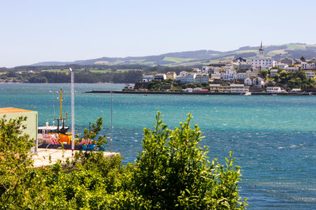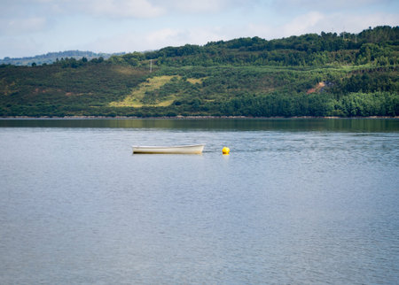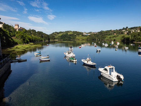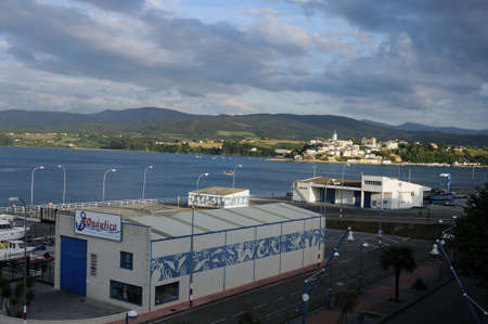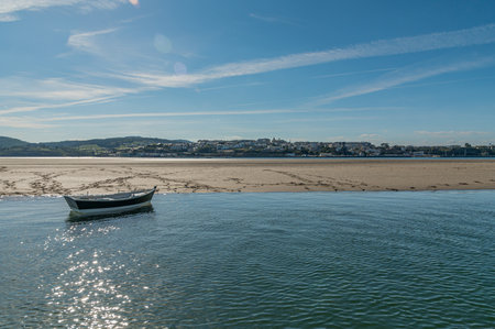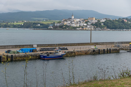 RIBADEO, SPAIN - AUGUST 30, 2022: View of the port of Ribadeo (Galicia), with the town of Castropol (in Asturias) in the background, on the other side of the Eo estuary, northern Spain