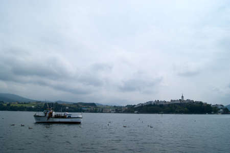 Fishermen in the boat among seagulls in Castropol