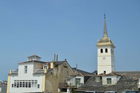 Bell Tower Of The Santiago Apostol Church And Houses With Very Old Roofs Practically Broken In Castropol. August 2, 2018. Architecture, Nature, Travel. Castropol, Asturias, Spain.
