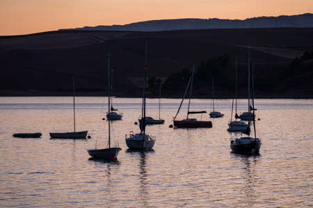Golden sunset gave a great silhouette of a coastal town from the sea