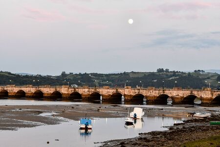 Views of the bridge of the fishing village of San Vicente de la Barquera with the boats in the port. Cantabria, Spain