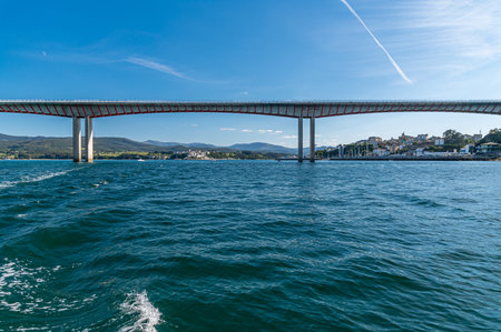 Anchored boats near thre bridge over the Vilanova de Arousa estuary