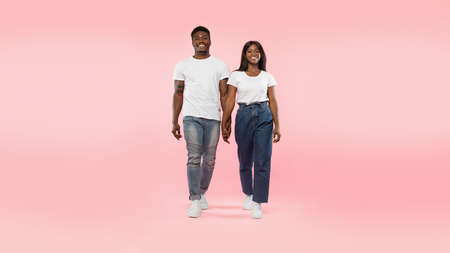 young couple in white t-shirts and jeans Design mockup Copy Space