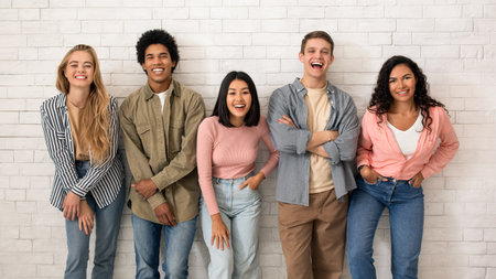 Group of five diverse young adults standing in casual clothing with bright light. Represents unity, diversity, and modern friendship.