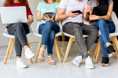 Group of business people sitting relax use technology together of smartphone checking social apps and working.Communication concept