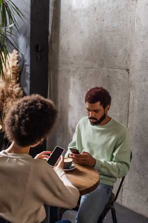 African american man using smartphone near cup of coffee and girlfriend in cafe