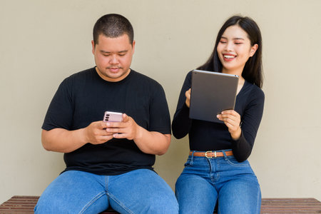 young man and woman stand next to a brick wall background, looking at their mobile phones