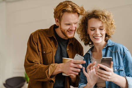 Boyfriend and girlfriend holding mobile phones and smiling at each other, using smartphones with touch screen to browse internet network. Modern couple laughing and using social media.
