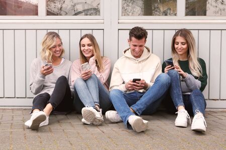 Vertical photo of a Group of happy friends using the mobile in the street. Young smiling people sharing with cell phone outdoors.