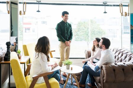 Group of young professional startup team working their project together and drinking a cup of coffee