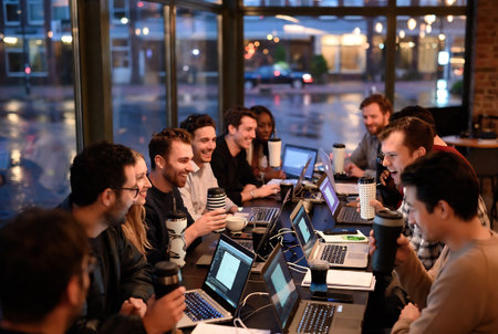 Successful international team working together on business strategy and innovation in a pleasant atmosphere.