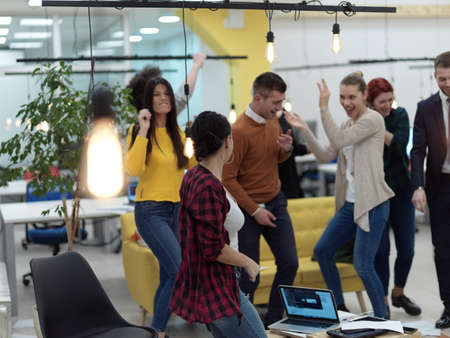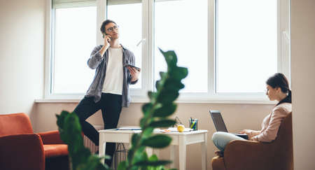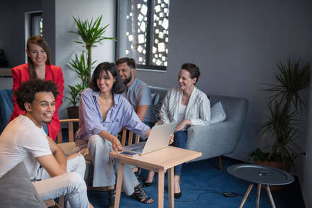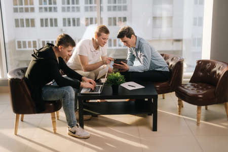 Professional energetic business team of young startupers cooperating in modern startup office. Concept of teamwork young business people.