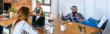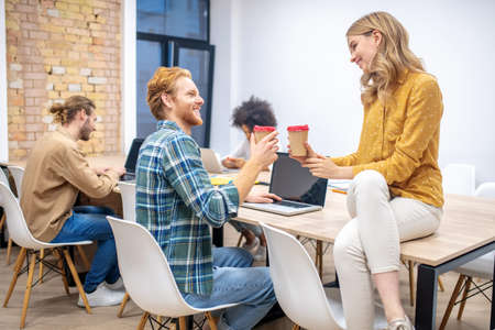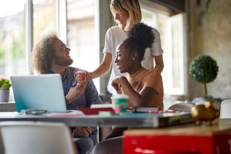 Young colleagues enjoying a coffee and a talk while working in a relaxed atmosphere at office together