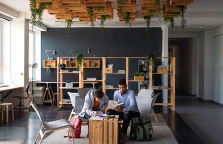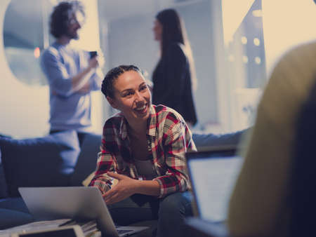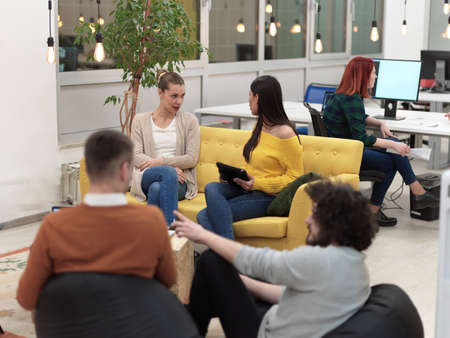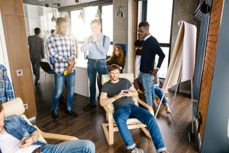 International multicultural business team.A young business man and woman sit in a modern relaxation space and talk about a new business.