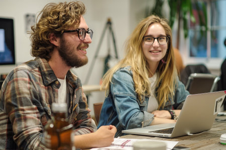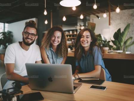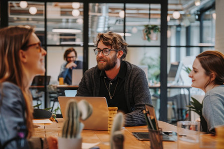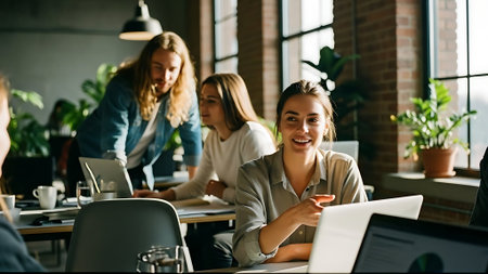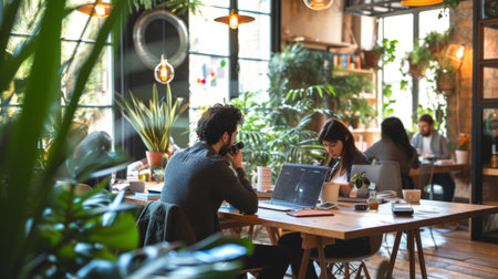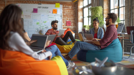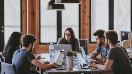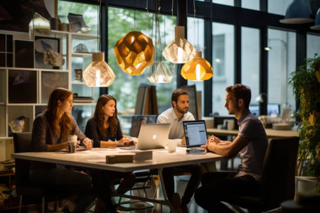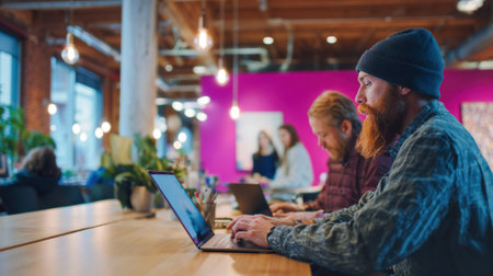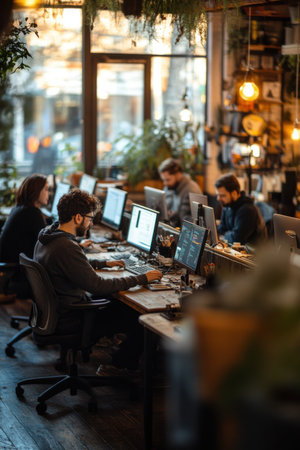 Team collaborating in a creative workspace urban studio digital design environment cozy atmosphere close-up view innovation and productivity