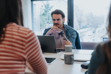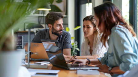 A team leader guides a group of people sitting around a table, each focused on their laptops, A determined leader leading a team meeting with enthusiasm and authority