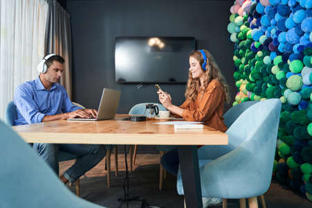 caucasian businessman and businesswoman in smart casual wear listening music from headphone and another working on computer in creative office with smiling and happy face