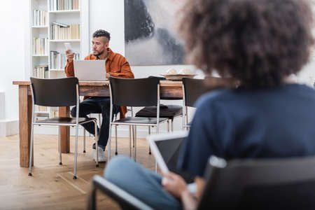 Creative colleagues working on laptop and digital tablet, sitting on the couch indoors. Work in marketing agency or design studio concept