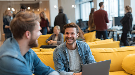 Two young men laugh together in a vibrant coworking space. The modern design and colorful furniture enhance a creative environment for collaboration and productivity.
