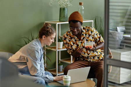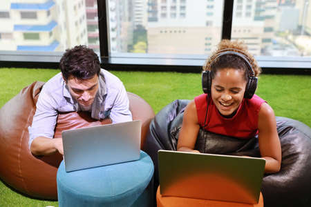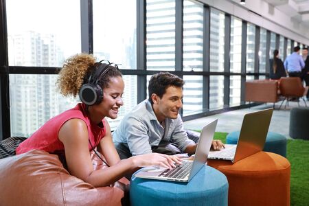 Portrait of two young people using laptop while relaxing in office lounge behind glass wall