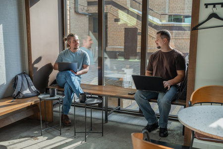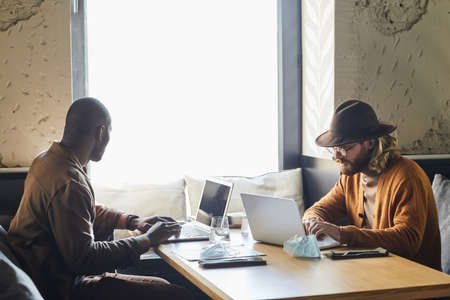 Side view portrait of two contemporary men using laptops while working at cafe table lit by sunlight in loft interior, copy space