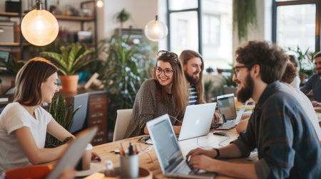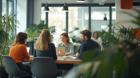 A team of professionals collaborated around a wooden table in a modern office with green plants, laptops, and natural light creating a productive atmosphere.