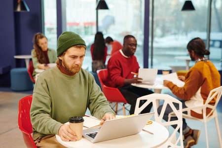 Group of young people in casual clothes sitting in cafe and drinking coffee.