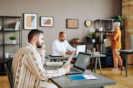 Serious young male economist analyzing financial papers in front of laptop by workplace in office against two busy coworkers