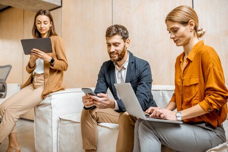 Colleagues working together in modern office using devices and gadgets during creative meeting