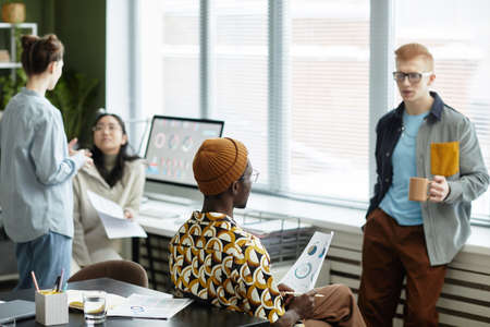 Group of young businesspersons having discussion and sharing opinions in meeting at office