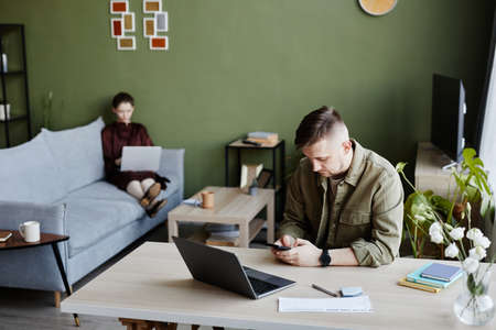 Young man sitting at his workplace with laptop and using mobile phone for work with his girlfriend working in background