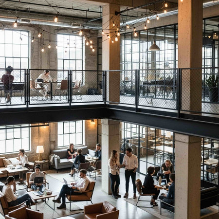 A creative professional works on a laptop in a vibrant co-working space with industrial decor