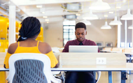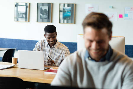 Smiling young african american businessman working on laptop in creative office. Unaltered, creative business, workplace, occupation, wireless technology.