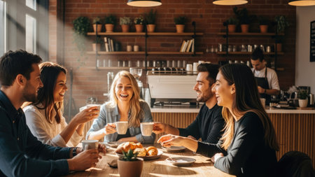 A group of diverse friends gathers in a warmly lit cafe, sharing coffee and laughter. The scene features a mix of people engaged in lively conversation, set against a backdrop of wooden shelves and potted plants. This image suggests themes of community, leisure, and social interaction, suitable for various editorial and commercial applications.