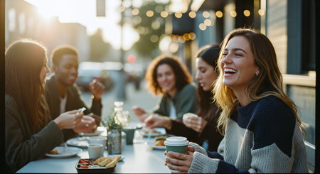 A group of friends enjoying a meal outdoors at a cafe, laughing and sharing moments, with warm sunlight and a cozy atmosphere