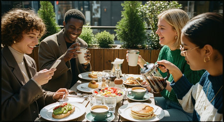 Generative AI : Multiracial group of friends having dinner party sitting at coffee bar table Young people enjoying meal on morning brunch time Life style concept with women and m