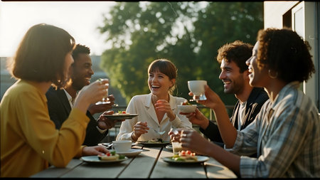 A group of six friends, diverse in ethnicity and age, sit around a table laden with food and drinks, laughing and chatting on a sunny day.