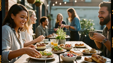 A group of friends enjoying brunch at a restaurant, featuring avocado toast with poached eggs in the foreground, laughter and conversation, warm sunlight