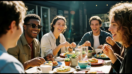 A group of friends enjoying a meal together at a cafe, laughing and sharing food, with sunlight illuminating the scene