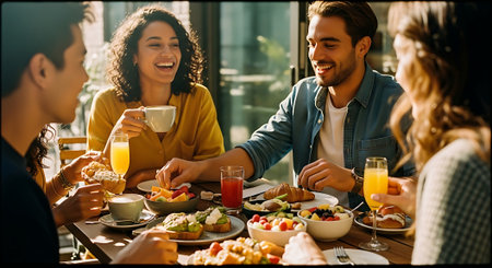 A group of four happy friends enjoys a delicious brunch at a table near a large window in a cozy cafe. They are laughing and talking while eating pancakes and eggs benedict, and drinking coffee and orange juice.