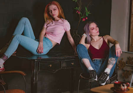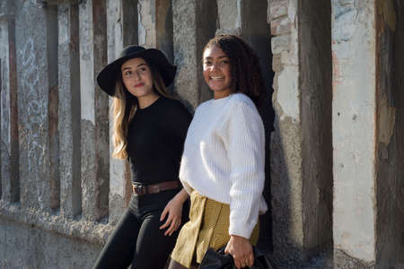 Portrait of a pair of beautiful fashionable Spanish girls standing against a texture wall. Fashion photography Street art