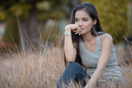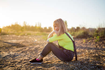 Teen girl with jeans and red shoes sitting a garden with the sunset behind her