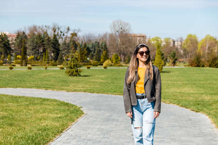 cheerful young woman hipster with sunglasses on walking alone in park in spring in midday.