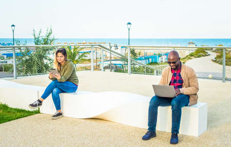 interracial couple sitting at seaside on bench holding a tablet and laptop, interactig with technology outside on autumn holidays.happy fiends on social media outdoor.tech, social, influencer lifestyle