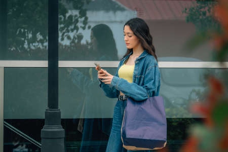 Outdoor portrait of Mexican woman wearing jeans. Woman walking in a park.