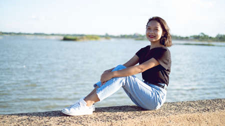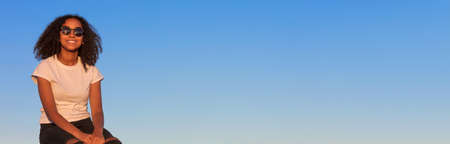 Outdoor panoramic web banner of beautiful happy mixed race African American girl teenager female young woman smiling with perfect teeth and sunglasses sitting in golden evening sunshine with blue sky