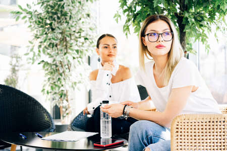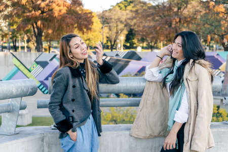 Two women friends talking happily and leaning on a railing. human relations concept.