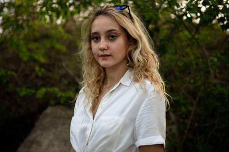 Portrait of a girl against a background of green trees. Blonde with curly hair.