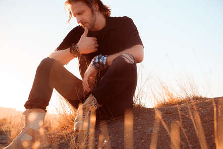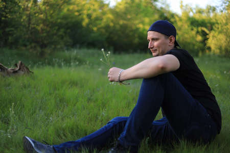 Man in cap and glasses sitting on the field, young man in glasses sitting on the grass in the field